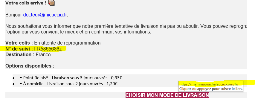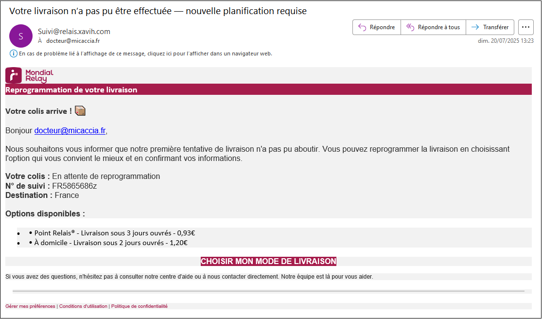 Dimanche dernier, on a reçu un email de (soi-disant) MONDIAL RELAY pour reprogrammer une livraison. Une livraison le dimanche ? Bien sûr ! C'est AMAZON ? Notre système de messagerie détecte automatiquement les spams et nous le signale. Mais, on va