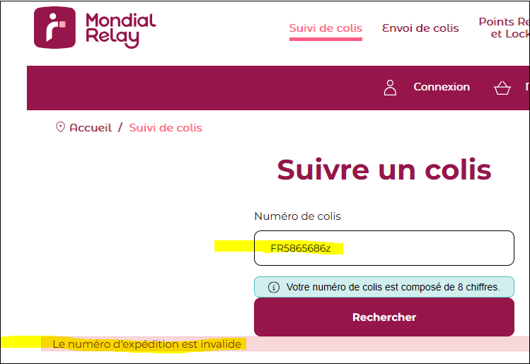 4. Le numéro de suivi : une rapide recherche sur le vrai site de MONDIAL RELAY permet de vérifier l'arnaque... car le colis n'existe pas :