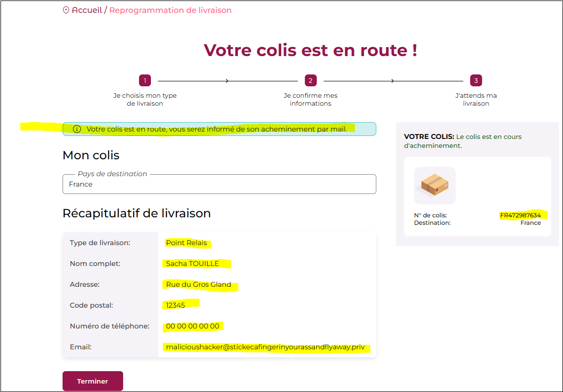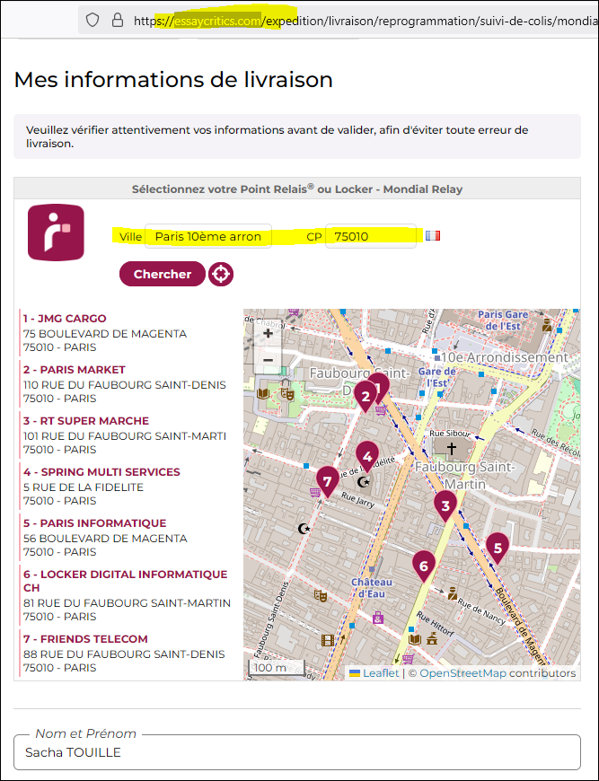 Remarquez le nom de domaine (faux)... et l'interactivité de la carte pour le point de livraison : comme une vraie !