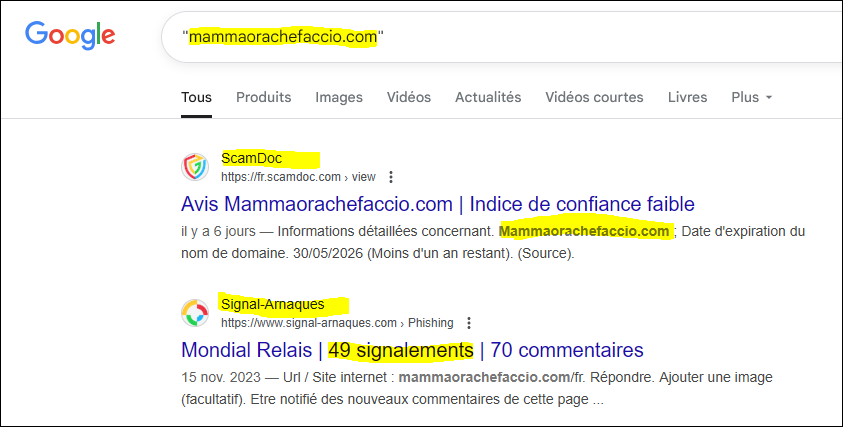 3. Les signalements dans les moteurs de recherche du site suspect (survol de la souris sur le lien "choisir mon mode de