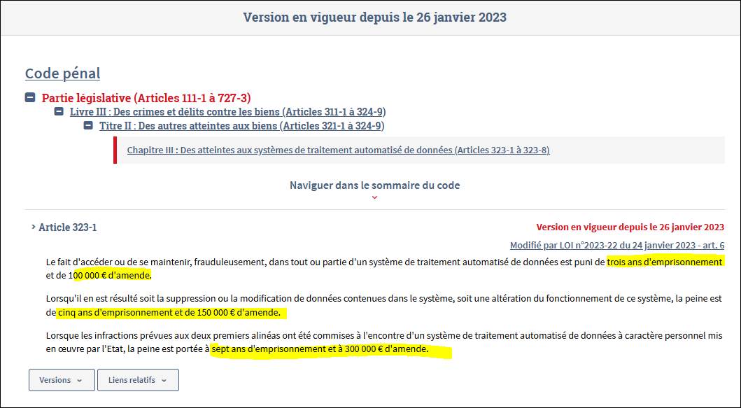 Quand même, il faut savoir que les individus qui s'introduisent illicitement dans les systèmes d'information encourent des sanctions pénales :